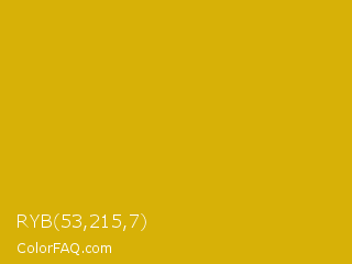 RYB 53,215,7 Color is a normal yellow color and the nearest color is Galliano #dcb20c. Hex code #d7b107 and RGB value is rgb(215,177,7). In RGB color space, this color is composed of 84% red, 69% green, 3% blue, In CMYK color space, this color is composed of 0% cyan, 18% magenta, 97% yellow , 16% black , In HSL color space, this color has a hue angle of 49° , 94% saturation and 44% lightness.