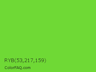 RYB 53,217,159 Color is a normal green color and the nearest color is Kiwi #8ee53f. Hex code #6fd935 and RGB value is rgb(111,217,53). In RGB color space, this color is composed of 44% red, 85% green, 21% blue, In CMYK color space, this color is composed of 49% cyan, 0% magenta, 76% yellow , 15% black , In HSL color space, this color has a hue angle of 99° , 68% saturation and 53% lightness.