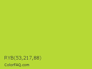 RYB 53,217,88 Color is a normal lime color and the nearest color is Conifer #acdd4d. Hex code #b6d935 and RGB value is rgb(182,217,53). In RGB color space, this color is composed of 71% red, 85% green, 21% blue, In CMYK color space, this color is composed of 16% cyan, 0% magenta, 76% yellow , 15% black , In HSL color space, this color has a hue angle of 73° , 68% saturation and 53% lightness.