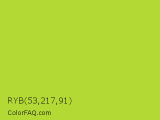 RYB 53,217,91 Color is a normal lime color and the nearest color is Android Green #a4c639. Hex code #b3d935 and RGB value is rgb(179,217,53). In RGB color space, this color is composed of 70% red, 85% green, 21% blue, In CMYK color space, this color is composed of 18% cyan, 0% magenta, 76% yellow , 15% black , In HSL color space, this color has a hue angle of 74° , 68% saturation and 53% lightness.