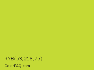 RYB 53,218,75 Color is a normal yellow color and the nearest color is Pear #d1e231. Hex code #c4da35 and RGB value is rgb(196,218,53). In RGB color space, this color is composed of 77% red, 85% green, 21% blue, In CMYK color space, this color is composed of 10% cyan, 0% magenta, 76% yellow , 15% black , In HSL color space, this color has a hue angle of 68° , 69% saturation and 53% lightness.