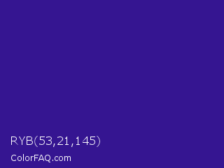 RYB 53,21,145 Color is a normal indigo color and the nearest color is Blue Gem #2c0e8c. Hex code #351591 and RGB value is rgb(53,21,145). In RGB color space, this color is composed of 21% red, 8% green, 57% blue, In CMYK color space, this color is composed of 63% cyan, 86% magenta, 0% yellow , 43% black , In HSL color space, this color has a hue angle of 255° , 75% saturation and 33% lightness.