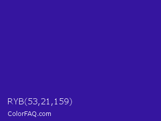 RYB 53,21,159 Color is a normal indigo color and the nearest color is Blue Gem #2c0e8c. Hex code #35159f and RGB value is rgb(53,21,159). In RGB color space, this color is composed of 21% red, 8% green, 62% blue, In CMYK color space, this color is composed of 67% cyan, 87% magenta, 0% yellow , 38% black , In HSL color space, this color has a hue angle of 254° , 77% saturation and 35% lightness.