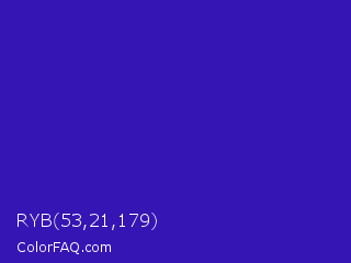RYB 53,21,179 Color is a normal indigo color and the nearest color is Interdimensional Blue #360ccc. Hex code #3515b3 and RGB value is rgb(53,21,179). In RGB color space, this color is composed of 21% red, 8% green, 70% blue, In CMYK color space, this color is composed of 70% cyan, 88% magenta, 0% yellow , 30% black , In HSL color space, this color has a hue angle of 252° , 79% saturation and 39% lightness.