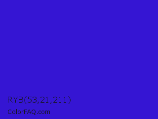 RYB 53,21,211 Color is a normal indigo color and the nearest color is Interdimensional Blue #360ccc. Hex code #3515d3 and RGB value is rgb(53,21,211). In RGB color space, this color is composed of 21% red, 8% green, 83% blue, In CMYK color space, this color is composed of 75% cyan, 90% magenta, 0% yellow , 17% black , In HSL color space, this color has a hue angle of 250° , 82% saturation and 45% lightness.