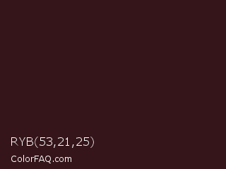 RYB 53,21,25 Color is a very dark red color and the nearest color is Tamarind #341515. Hex code #351519 and RGB value is rgb(53,21,25). In RGB color space, this color is composed of 21% red, 8% green, 10% blue, In CMYK color space, this color is composed of 0% cyan, 60% magenta, 53% yellow , 79% black , In HSL color space, this color has a hue angle of 353° , 43% saturation and 15% lightness.