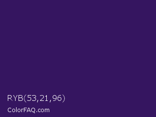 RYB 53,21,96 Color is a dark violet color and the nearest color is Jagger #350e57. Hex code #351560 and RGB value is rgb(53,21,96). In RGB color space, this color is composed of 21% red, 8% green, 38% blue, In CMYK color space, this color is composed of 45% cyan, 78% magenta, 0% yellow , 62% black , In HSL color space, this color has a hue angle of 266° , 64% saturation and 23% lightness.