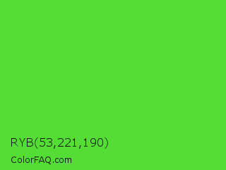 RYB 53,221,190 Color is a normal green color and the nearest color is Harlequin Green #46cb18. Hex code #54dd35 and RGB value is rgb(84,221,53). In RGB color space, this color is composed of 33% red, 87% green, 21% blue, In CMYK color space, this color is composed of 62% cyan, 0% magenta, 76% yellow , 13% black , In HSL color space, this color has a hue angle of 109° , 71% saturation and 54% lightness.