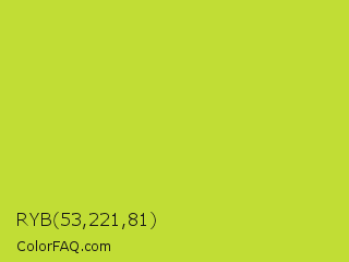 RYB 53,221,81 Color is a normal yellow color and the nearest color is Pear #d1e231. Hex code #c1dd35 and RGB value is rgb(193,221,53). In RGB color space, this color is composed of 76% red, 87% green, 21% blue, In CMYK color space, this color is composed of 13% cyan, 0% magenta, 76% yellow , 13% black , In HSL color space, this color has a hue angle of 70° , 71% saturation and 54% lightness.