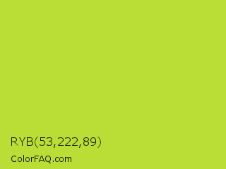 RYB 53,222,89 Color is a normal lime color and the nearest color is Pear #d1e231. Hex code #bade35 and RGB value is rgb(186,222,53). In RGB color space, this color is composed of 73% red, 87% green, 21% blue, In CMYK color space, this color is composed of 16% cyan, 0% magenta, 76% yellow , 13% black , In HSL color space, this color has a hue angle of 73° , 72% saturation and 54% lightness.