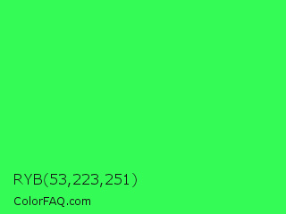 RYB 53,223,251 Color is a normal green color and the nearest color is UFO Green #3cd070. Hex code #35fb56 and RGB value is rgb(53,251,86). In RGB color space, this color is composed of 21% red, 98% green, 34% blue, In CMYK color space, this color is composed of 79% cyan, 0% magenta, 66% yellow , 2% black , In HSL color space, this color has a hue angle of 130° , 96% saturation and 60% lightness.