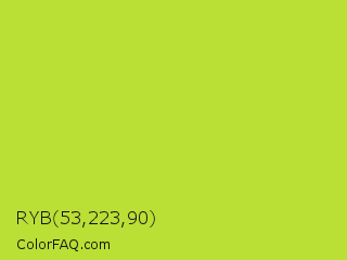 RYB 53,223,90 Color is a normal lime color and the nearest color is Pear #d1e231. Hex code #badf35 and RGB value is rgb(186,223,53). In RGB color space, this color is composed of 73% red, 87% green, 21% blue, In CMYK color space, this color is composed of 17% cyan, 0% magenta, 76% yellow , 13% black , In HSL color space, this color has a hue angle of 73° , 73% saturation and 54% lightness.