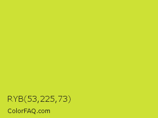 RYB 53,225,73 Color is a normal yellow color and the nearest color is Pear #d1e231. Hex code #cde135 and RGB value is rgb(205,225,53). In RGB color space, this color is composed of 80% red, 88% green, 21% blue, In CMYK color space, this color is composed of 9% cyan, 0% magenta, 76% yellow , 12% black , In HSL color space, this color has a hue angle of 67° , 74% saturation and 55% lightness.