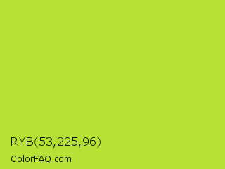 RYB 53,225,96 Color is a normal lime color and the nearest color is Green Lizard #a7f432. Hex code #b6e135 and RGB value is rgb(182,225,53). In RGB color space, this color is composed of 71% red, 88% green, 21% blue, In CMYK color space, this color is composed of 19% cyan, 0% magenta, 76% yellow , 12% black , In HSL color space, this color has a hue angle of 75° , 74% saturation and 55% lightness.