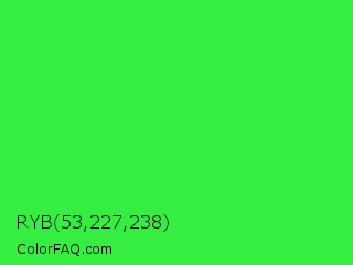 RYB 53,227,238 Color is a normal green color and the nearest color is Lime Green #32cd32. Hex code #35ee41 and RGB value is rgb(53,238,65). In RGB color space, this color is composed of 21% red, 93% green, 25% blue, In CMYK color space, this color is composed of 78% cyan, 0% magenta, 73% yellow , 7% black , In HSL color space, this color has a hue angle of 124° , 84% saturation and 57% lightness.