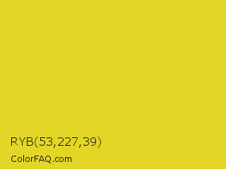 RYB 53,227,39 Color is a normal yellow color and the nearest color is Sunflower #e4d422. Hex code #e3d627 and RGB value is rgb(227,214,39). In RGB color space, this color is composed of 89% red, 84% green, 15% blue, In CMYK color space, this color is composed of 0% cyan, 6% magenta, 83% yellow , 11% black , In HSL color space, this color has a hue angle of 56° , 77% saturation and 52% lightness.