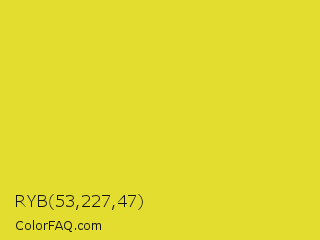 RYB 53,227,47 Color is a normal yellow color and the nearest color is Dandelion #f0e130. Hex code #e3dd2f and RGB value is rgb(227,221,47). In RGB color space, this color is composed of 89% red, 87% green, 18% blue, In CMYK color space, this color is composed of 0% cyan, 3% magenta, 79% yellow , 11% black , In HSL color space, this color has a hue angle of 58° , 76% saturation and 54% lightness.