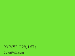 RYB 53,228,167 Color is a normal green color and the nearest color is Kiwi #8ee53f. Hex code #72e435 and RGB value is rgb(114,228,53). In RGB color space, this color is composed of 45% red, 89% green, 21% blue, In CMYK color space, this color is composed of 50% cyan, 0% magenta, 77% yellow , 11% black , In HSL color space, this color has a hue angle of 99° , 76% saturation and 55% lightness.
