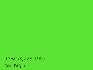 RYB 53,228,190 Color is a normal green color and the nearest color is Harlequin Green #46cb18. Hex code #5be435 and RGB value is rgb(91,228,53). In RGB color space, this color is composed of 36% red, 89% green, 21% blue, In CMYK color space, this color is composed of 60% cyan, 0% magenta, 77% yellow , 11% black , In HSL color space, this color has a hue angle of 107° , 76% saturation and 55% lightness.