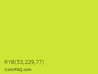 RYB 53,229,77 Color is a normal yellow color and the nearest color is Pear #d1e231. Hex code #cde535 and RGB value is rgb(205,229,53). In RGB color space, this color is composed of 80% red, 90% green, 21% blue, In CMYK color space, this color is composed of 10% cyan, 0% magenta, 77% yellow , 10% black , In HSL color space, this color has a hue angle of 68° , 77% saturation and 55% lightness.