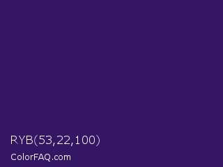 RYB 53,22,100 Color is a dark violet color and the nearest color is Scarlet Gum #431560. Hex code #351664 and RGB value is rgb(53,22,100). In RGB color space, this color is composed of 21% red, 9% green, 39% blue, In CMYK color space, this color is composed of 47% cyan, 78% magenta, 0% yellow , 61% black , In HSL color space, this color has a hue angle of 264° , 64% saturation and 24% lightness.