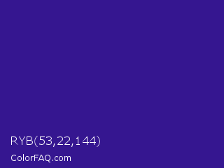 RYB 53,22,144 Color is a normal indigo color and the nearest color is Pixie Powder #391285. Hex code #351690 and RGB value is rgb(53,22,144). In RGB color space, this color is composed of 21% red, 9% green, 56% blue, In CMYK color space, this color is composed of 63% cyan, 85% magenta, 0% yellow , 44% black , In HSL color space, this color has a hue angle of 255° , 73% saturation and 33% lightness.