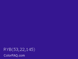 RYB 53,22,145 Color is a normal indigo color and the nearest color is Blue Gem #2c0e8c. Hex code #351691 and RGB value is rgb(53,22,145). In RGB color space, this color is composed of 21% red, 9% green, 57% blue, In CMYK color space, this color is composed of 63% cyan, 85% magenta, 0% yellow , 43% black , In HSL color space, this color has a hue angle of 255° , 74% saturation and 33% lightness.