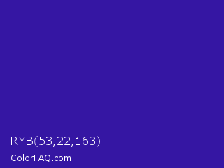 RYB 53,22,163 Color is a normal indigo color and the nearest color is Blue Gem #2c0e8c. Hex code #3516a3 and RGB value is rgb(53,22,163). In RGB color space, this color is composed of 21% red, 9% green, 64% blue, In CMYK color space, this color is composed of 67% cyan, 87% magenta, 0% yellow , 36% black , In HSL color space, this color has a hue angle of 253° , 76% saturation and 36% lightness.