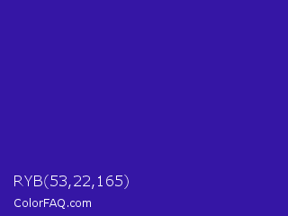 RYB 53,22,165 Color is a normal indigo color and the nearest color is Blue Gem #2c0e8c. Hex code #3516a5 and RGB value is rgb(53,22,165). In RGB color space, this color is composed of 21% red, 9% green, 65% blue, In CMYK color space, this color is composed of 68% cyan, 87% magenta, 0% yellow , 35% black , In HSL color space, this color has a hue angle of 253° , 76% saturation and 37% lightness.