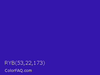 RYB 53,22,173 Color is a normal indigo color and the nearest color is Interdimensional Blue #360ccc. Hex code #3516ad and RGB value is rgb(53,22,173). In RGB color space, this color is composed of 21% red, 9% green, 68% blue, In CMYK color space, this color is composed of 69% cyan, 87% magenta, 0% yellow , 32% black , In HSL color space, this color has a hue angle of 252° , 77% saturation and 38% lightness.
