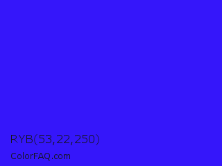 RYB 53,22,250 Color is a normal indigo color and the nearest color is Electric Ultramarine #3f00ff. Hex code #3516fa and RGB value is rgb(53,22,250). In RGB color space, this color is composed of 21% red, 9% green, 98% blue, In CMYK color space, this color is composed of 79% cyan, 91% magenta, 0% yellow , 2% black , In HSL color space, this color has a hue angle of 248° , 96% saturation and 53% lightness.