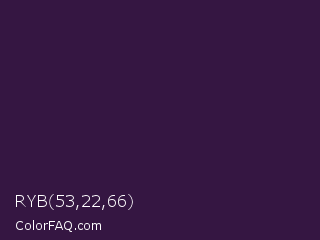 RYB 53,22,66 Color is a very dark purple color and the nearest color is Valentino #350e42. Hex code #351642 and RGB value is rgb(53,22,66). In RGB color space, this color is composed of 21% red, 9% green, 26% blue, In CMYK color space, this color is composed of 20% cyan, 67% magenta, 0% yellow , 74% black , In HSL color space, this color has a hue angle of 282° , 50% saturation and 17% lightness.