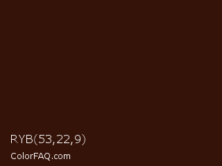 RYB 53,22,9 Color is a very dark red color and the nearest color is Rebel #3c1206. Hex code #351309 and RGB value is rgb(53,19,9). In RGB color space, this color is composed of 21% red, 7% green, 4% blue, In CMYK color space, this color is composed of 0% cyan, 64% magenta, 83% yellow , 79% black , In HSL color space, this color has a hue angle of 14° , 71% saturation and 12% lightness.