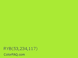 RYB 53,234,117 Color is a normal green color and the nearest color is Green Lizard #a7f432. Hex code #aaea35 and RGB value is rgb(170,234,53). In RGB color space, this color is composed of 67% red, 92% green, 21% blue, In CMYK color space, this color is composed of 27% cyan, 0% magenta, 77% yellow , 8% black , In HSL color space, this color has a hue angle of 81° , 81% saturation and 56% lightness.