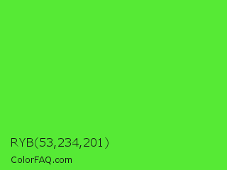 RYB 53,234,201 Color is a normal green color and the nearest color is Harlequin Green #46cb18. Hex code #56ea35 and RGB value is rgb(86,234,53). In RGB color space, this color is composed of 34% red, 92% green, 21% blue, In CMYK color space, this color is composed of 63% cyan, 0% magenta, 77% yellow , 8% black , In HSL color space, this color has a hue angle of 109° , 81% saturation and 56% lightness.