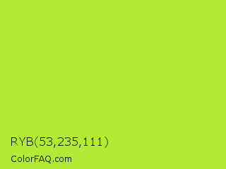 RYB 53,235,111 Color is a normal lime color and the nearest color is Green Lizard #a7f432. Hex code #b1eb35 and RGB value is rgb(177,235,53). In RGB color space, this color is composed of 69% red, 92% green, 21% blue, In CMYK color space, this color is composed of 25% cyan, 0% magenta, 77% yellow , 8% black , In HSL color space, this color has a hue angle of 79° , 82% saturation and 56% lightness.