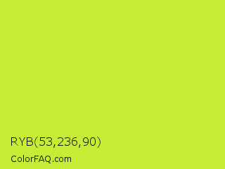 RYB 53,236,90 Color is a normal lime color and the nearest color is Pear #d1e231. Hex code #c7ec35 and RGB value is rgb(199,236,53). In RGB color space, this color is composed of 78% red, 93% green, 21% blue, In CMYK color space, this color is composed of 16% cyan, 0% magenta, 78% yellow , 7% black , In HSL color space, this color has a hue angle of 72° , 83% saturation and 57% lightness.