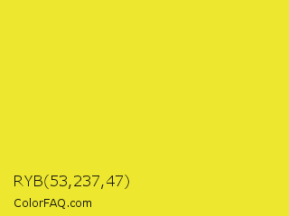 RYB 53,237,47 Color is a normal yellow color and the nearest color is Dandelion #f0e130. Hex code #ede72f and RGB value is rgb(237,231,47). In RGB color space, this color is composed of 93% red, 91% green, 18% blue, In CMYK color space, this color is composed of 0% cyan, 3% magenta, 80% yellow , 7% black , In HSL color space, this color has a hue angle of 58° , 84% saturation and 56% lightness.