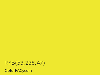 RYB 53,238,47 Color is a normal yellow color and the nearest color is Dandelion #f0e130. Hex code #eee82f and RGB value is rgb(238,232,47). In RGB color space, this color is composed of 93% red, 91% green, 18% blue, In CMYK color space, this color is composed of 0% cyan, 3% magenta, 80% yellow , 7% black , In HSL color space, this color has a hue angle of 58° , 85% saturation and 56% lightness.
