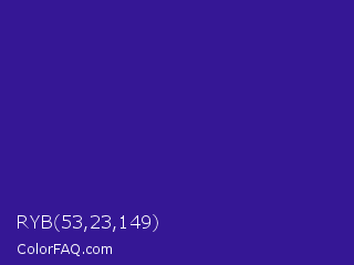 RYB 53,23,149 Color is a normal indigo color and the nearest color is Blue Gem #2c0e8c. Hex code #351795 and RGB value is rgb(53,23,149). In RGB color space, this color is composed of 21% red, 9% green, 58% blue, In CMYK color space, this color is composed of 64% cyan, 85% magenta, 0% yellow , 42% black , In HSL color space, this color has a hue angle of 254° , 73% saturation and 34% lightness.