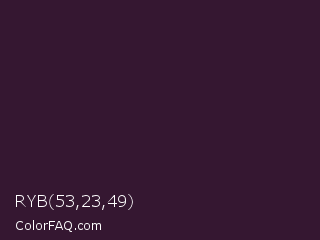RYB 53,23,49 Color is a very dark magenta color and the nearest color is Dark Purple #301934. Hex code #351731 and RGB value is rgb(53,23,49). In RGB color space, this color is composed of 21% red, 9% green, 19% blue, In CMYK color space, this color is composed of 0% cyan, 57% magenta, 8% yellow , 79% black , In HSL color space, this color has a hue angle of 308° , 39% saturation and 15% lightness.