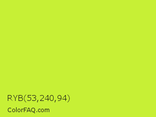 RYB 53,240,94 Color is a normal lime color and the nearest color is Pear #d1e231. Hex code #c7f035 and RGB value is rgb(199,240,53). In RGB color space, this color is composed of 78% red, 94% green, 21% blue, In CMYK color space, this color is composed of 17% cyan, 0% magenta, 78% yellow , 6% black , In HSL color space, this color has a hue angle of 73° , 86% saturation and 57% lightness.