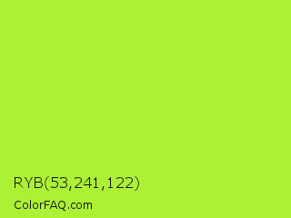 RYB 53,241,122 Color is a normal green color and the nearest color is Green Lizard #a7f432. Hex code #acf135 and RGB value is rgb(172,241,53). In RGB color space, this color is composed of 67% red, 95% green, 21% blue, In CMYK color space, this color is composed of 29% cyan, 0% magenta, 78% yellow , 5% black , In HSL color space, this color has a hue angle of 82° , 87% saturation and 58% lightness.