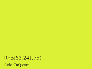 RYB 53,241,75 Color is a normal yellow color and the nearest color is Pear #d1e231. Hex code #dbf135 and RGB value is rgb(219,241,53). In RGB color space, this color is composed of 86% red, 95% green, 21% blue, In CMYK color space, this color is composed of 9% cyan, 0% magenta, 78% yellow , 5% black , In HSL color space, this color has a hue angle of 67° , 87% saturation and 58% lightness.