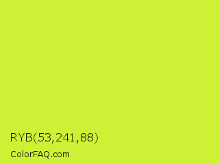 RYB 53,241,88 Color is a normal lime color and the nearest color is Pear #d1e231. Hex code #cef135 and RGB value is rgb(206,241,53). In RGB color space, this color is composed of 81% red, 95% green, 21% blue, In CMYK color space, this color is composed of 15% cyan, 0% magenta, 78% yellow , 5% black , In HSL color space, this color has a hue angle of 71° , 87% saturation and 58% lightness.