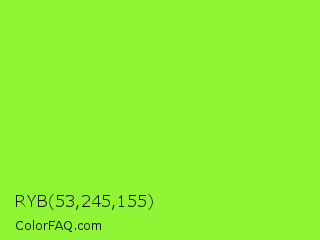 RYB 53,245,155 Color is a normal green color and the nearest color is Spring Frost #87ff2a. Hex code #8ff535 and RGB value is rgb(143,245,53). In RGB color space, this color is composed of 56% red, 96% green, 21% blue, In CMYK color space, this color is composed of 42% cyan, 0% magenta, 78% yellow , 4% black , In HSL color space, this color has a hue angle of 92° , 91% saturation and 58% lightness.