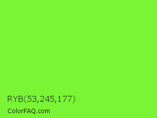 RYB 53,245,177 Color is a normal green color and the nearest color is Spring Frost #87ff2a. Hex code #79f535 and RGB value is rgb(121,245,53). In RGB color space, this color is composed of 47% red, 96% green, 21% blue, In CMYK color space, this color is composed of 51% cyan, 0% magenta, 78% yellow , 4% black , In HSL color space, this color has a hue angle of 99° , 91% saturation and 58% lightness.