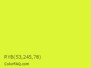 RYB 53,245,78 Color is a normal yellow color and the nearest color is Pear #d1e231. Hex code #dcf535 and RGB value is rgb(220,245,53). In RGB color space, this color is composed of 86% red, 96% green, 21% blue, In CMYK color space, this color is composed of 10% cyan, 0% magenta, 78% yellow , 4% black , In HSL color space, this color has a hue angle of 68° , 91% saturation and 58% lightness.
