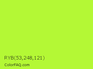 RYB 53,248,121 Color is a normal green color and the nearest color is Green Yellow #adff2f. Hex code #b4f835 and RGB value is rgb(180,248,53). In RGB color space, this color is composed of 71% red, 97% green, 21% blue, In CMYK color space, this color is composed of 27% cyan, 0% magenta, 79% yellow , 3% black , In HSL color space, this color has a hue angle of 81° , 93% saturation and 59% lightness.