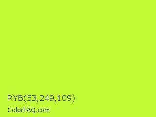 RYB 53,249,109 Color is a normal lime color and the nearest color is Green Yellow #adff2f. Hex code #c1f935 and RGB value is rgb(193,249,53). In RGB color space, this color is composed of 76% red, 98% green, 21% blue, In CMYK color space, this color is composed of 22% cyan, 0% magenta, 79% yellow , 2% black , In HSL color space, this color has a hue angle of 77° , 94% saturation and 59% lightness.